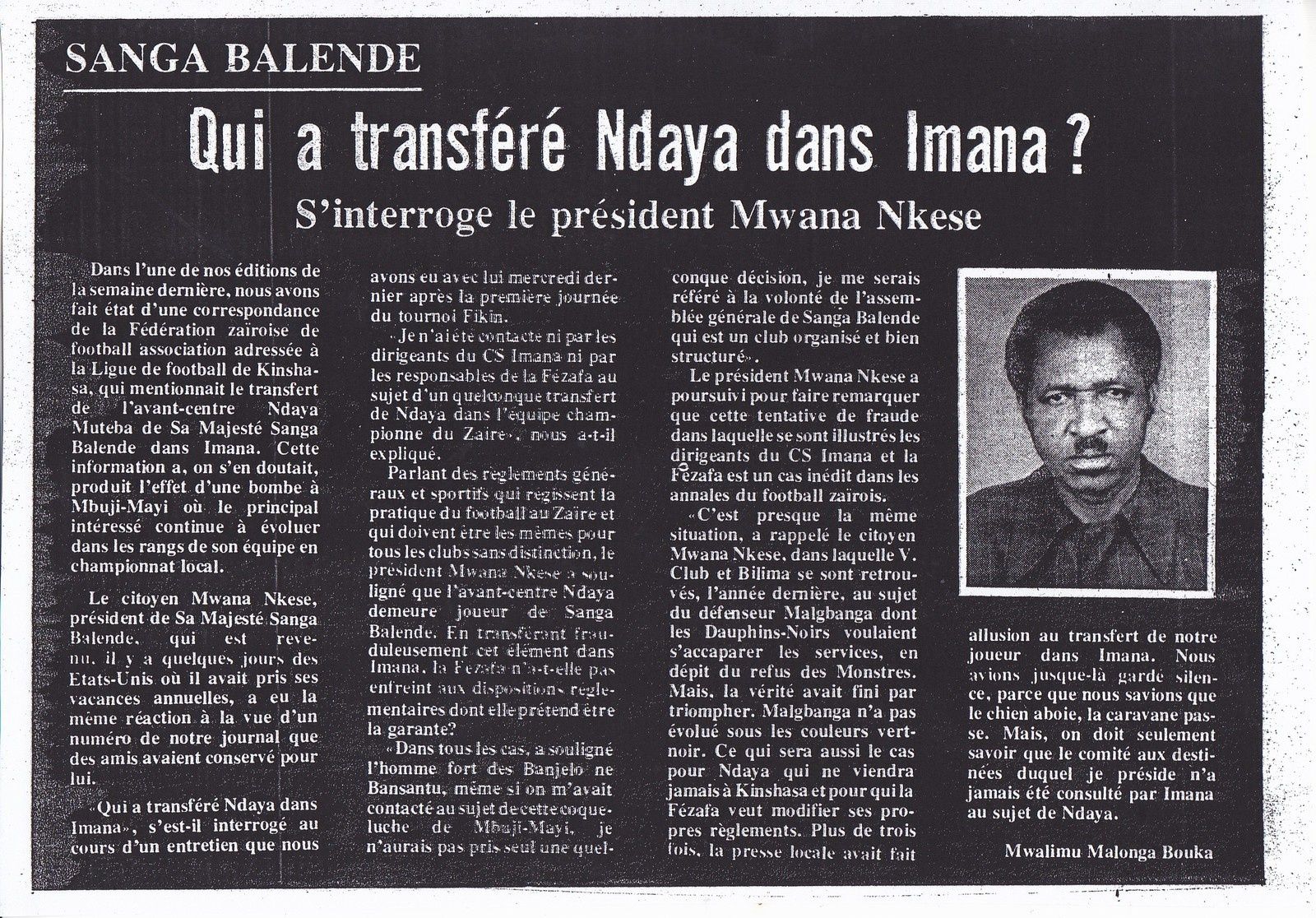 Comme on peut le lire à travers la coupure ci-dessous, le président de Sanga Balende à l’époque s’insurgeait contre une information officieuse annonçant le transfert de l’ancien centre-avant Ndaya Muteba dans l’équipe d’Imana. Une information qui s’était avérée totalement fausse dans la mesure où Ndaya n’avait jamais endossé les couleurs vert –blanc jusqu’à sa mort.