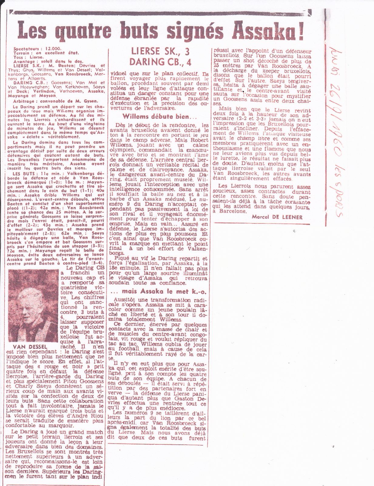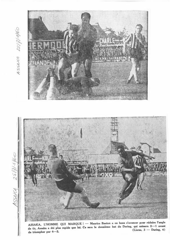 Voici à cet égard un article d’archive envoyé par nos cousins belges de l’asbl Foot 100 sur l’exploit réalisé par ASSAKA le 25 septembre 1960, en marquant tous les quatre buts de l’équipe Daring face à Lierse.