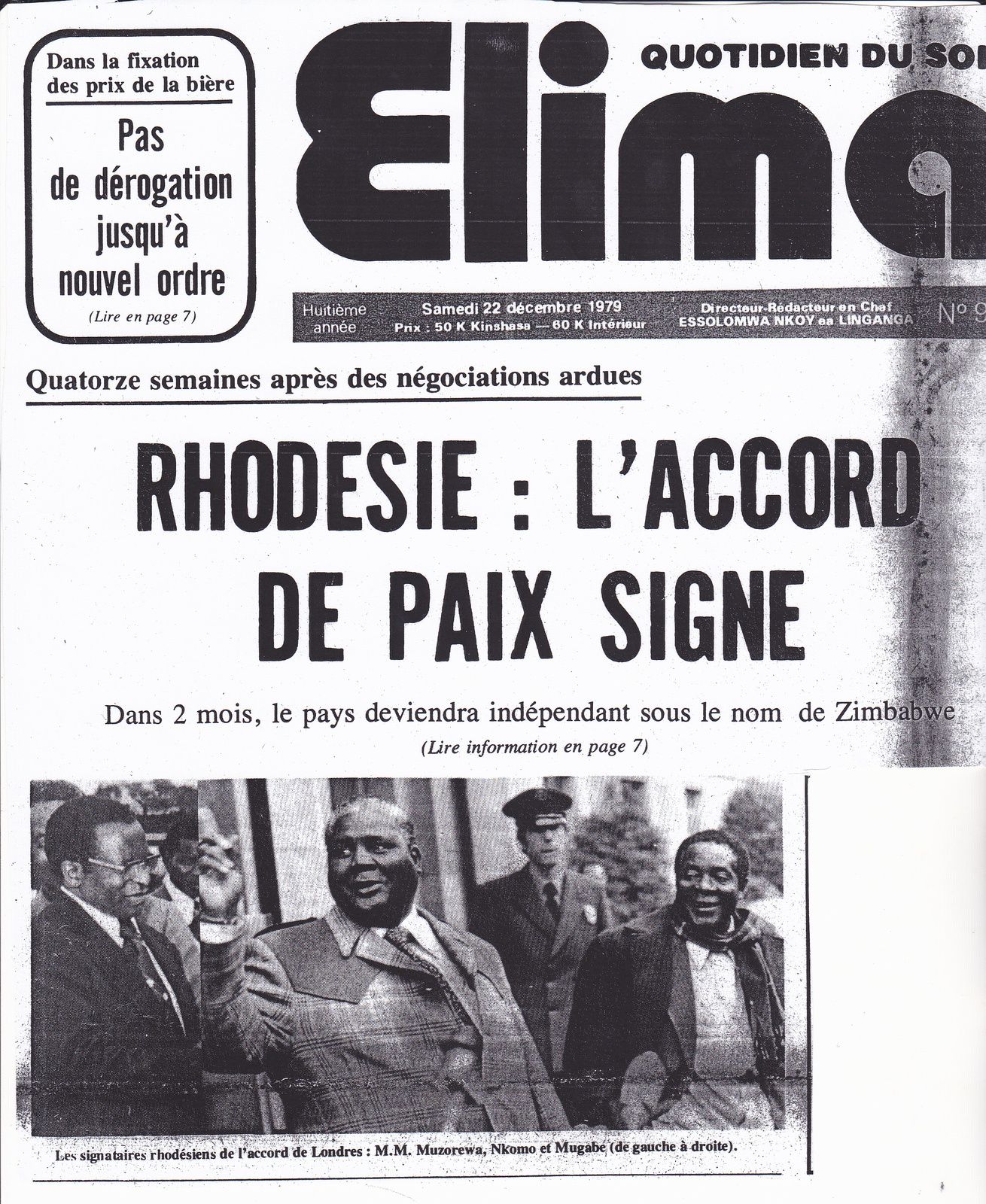 Après quatorze semaines d’âpres négociations à Londres, les belligérants qui étaient représentés entre autres par trois figures historiques sur la photo d'en-bas, à savoir : l’évêque Abel Muzorewa, Joshwa Nkomo, et Robert Mugabe finirent par signer un accord de paix pour la future République du Zimbabwe.