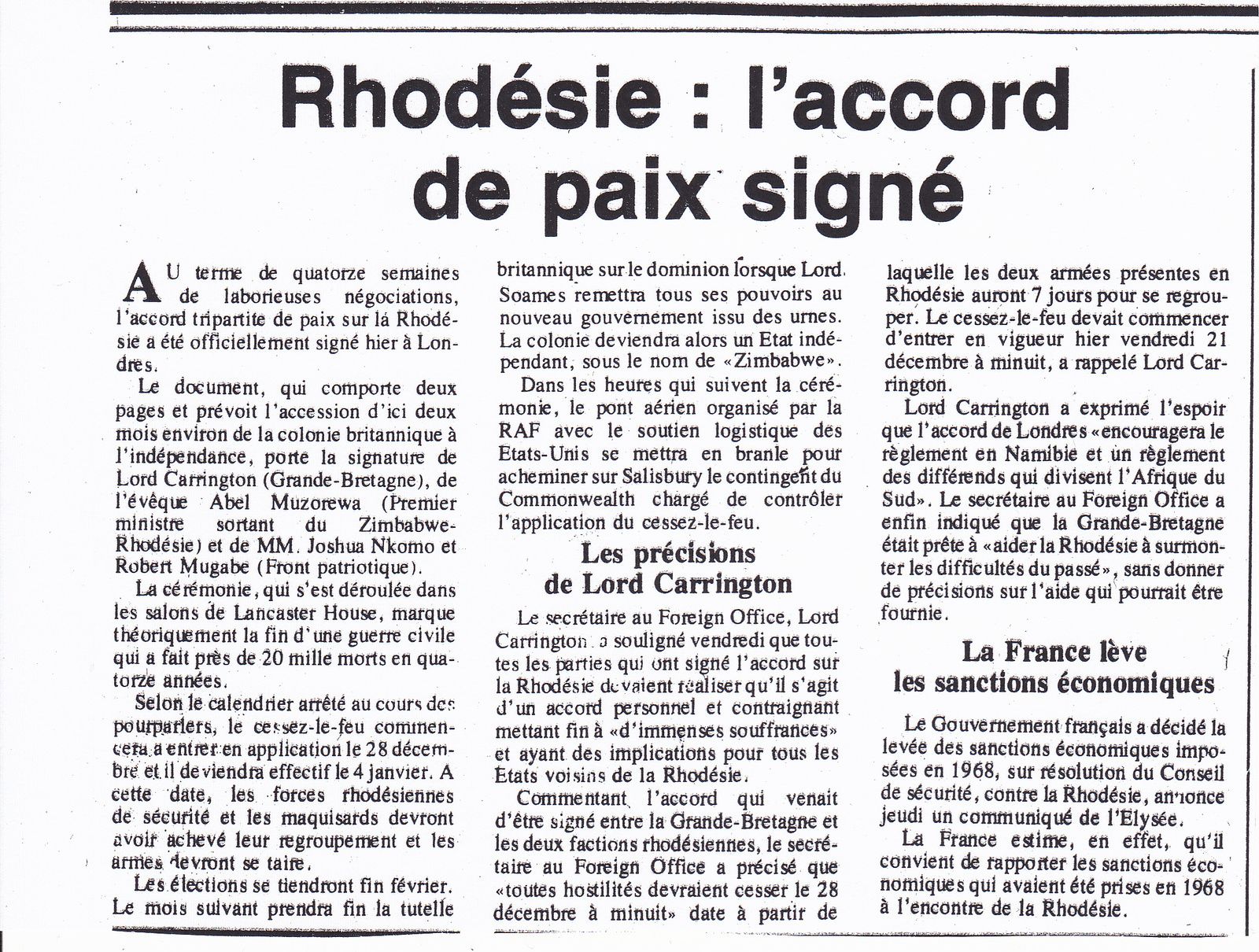 21 Décembre 1979 : Signature de l’accord de paix sur la Rhodésie du Sud (futur Zimbabwe)